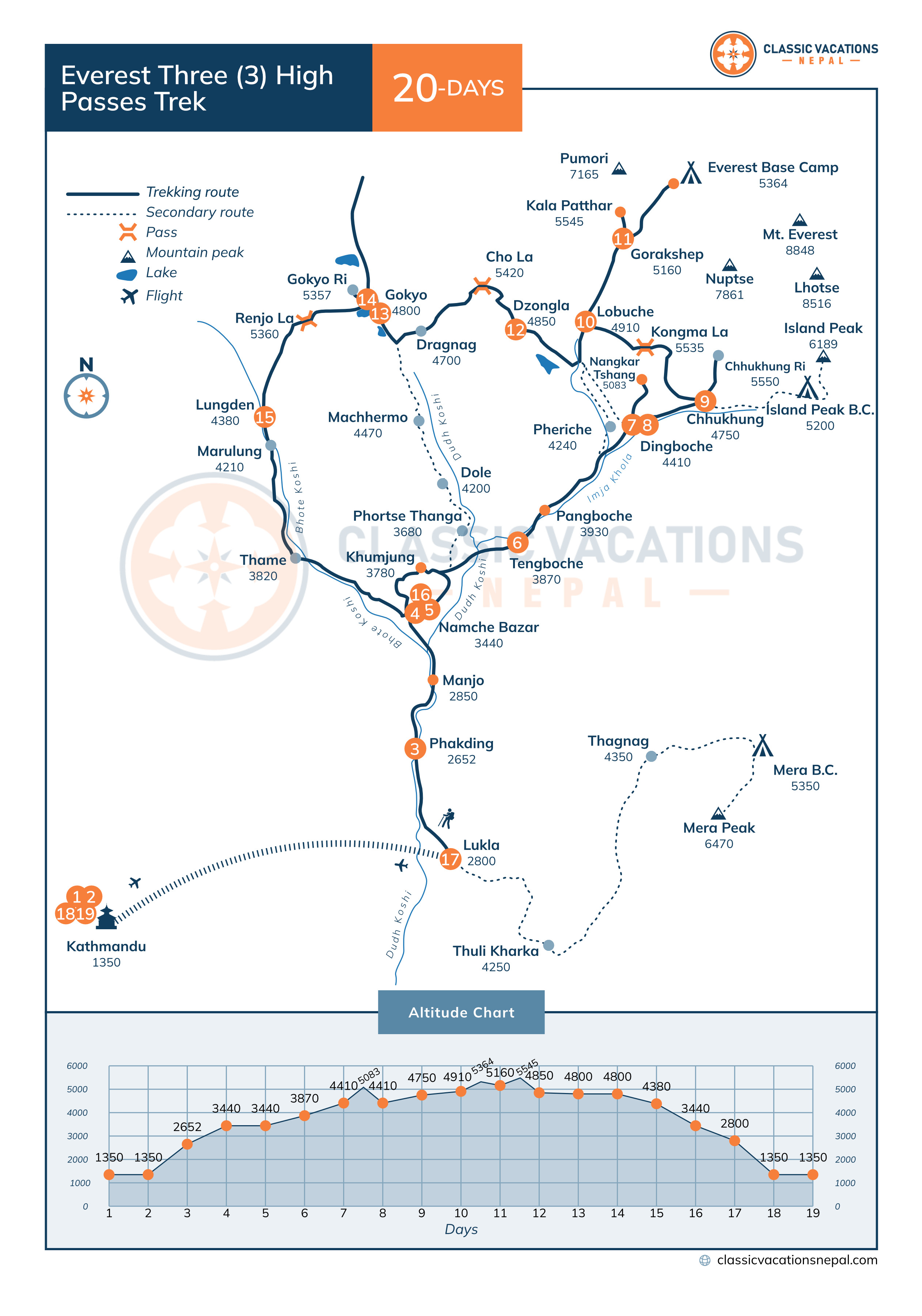US$- 2780 Per PersonEverest Two (2) High Passes Trek is the most challenging and strenuous trek of the Everest Region. This adventurous trek combines the three high passes of the Everest Region, namely Renjo-la (5340m), Cho La Pass (5420m) two high passes, this itinerary takes you to the famous Everest Base Camp (5364m), Kala Patthar (5545m) viewpoint & Gokyo Ri (5440m) so this trek is truly an ultimate Himalayan trekking experience. Each pass offers magnificent views of snow-capped mountains including Mt. Everest (8848 m), alpine glaciers, glacier lakes, ice ridge, and Himalayan landscapes so it is an incredible trip.